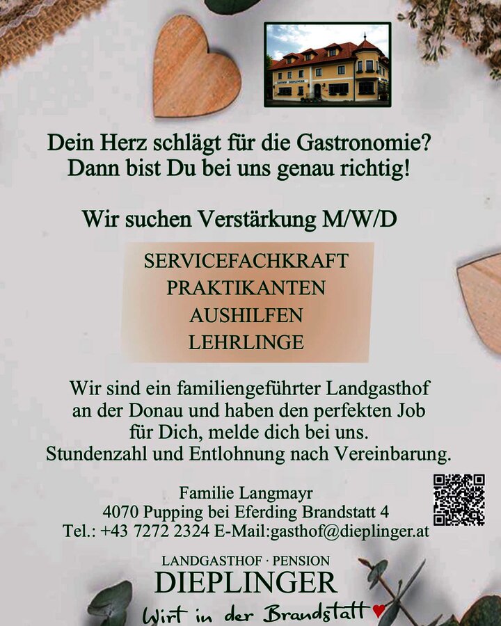 Wir bieten Dir einen Arbeitsplatz direkt an der Donau in einem familiengeführten Landgasthof. Ganzjahres- oder Saisonstelle für Aushilfen bzw. 20 - 40 Stunden/ Woche, 4 oder 5- Tage Woche. Wir sind natürlich bereit den kollektivvertraglichen Mindestlohn bei entsprechender Ausbildung, Erfahrung und Leistung links liegen zu lassen und Dir mehr zu bezahlen.