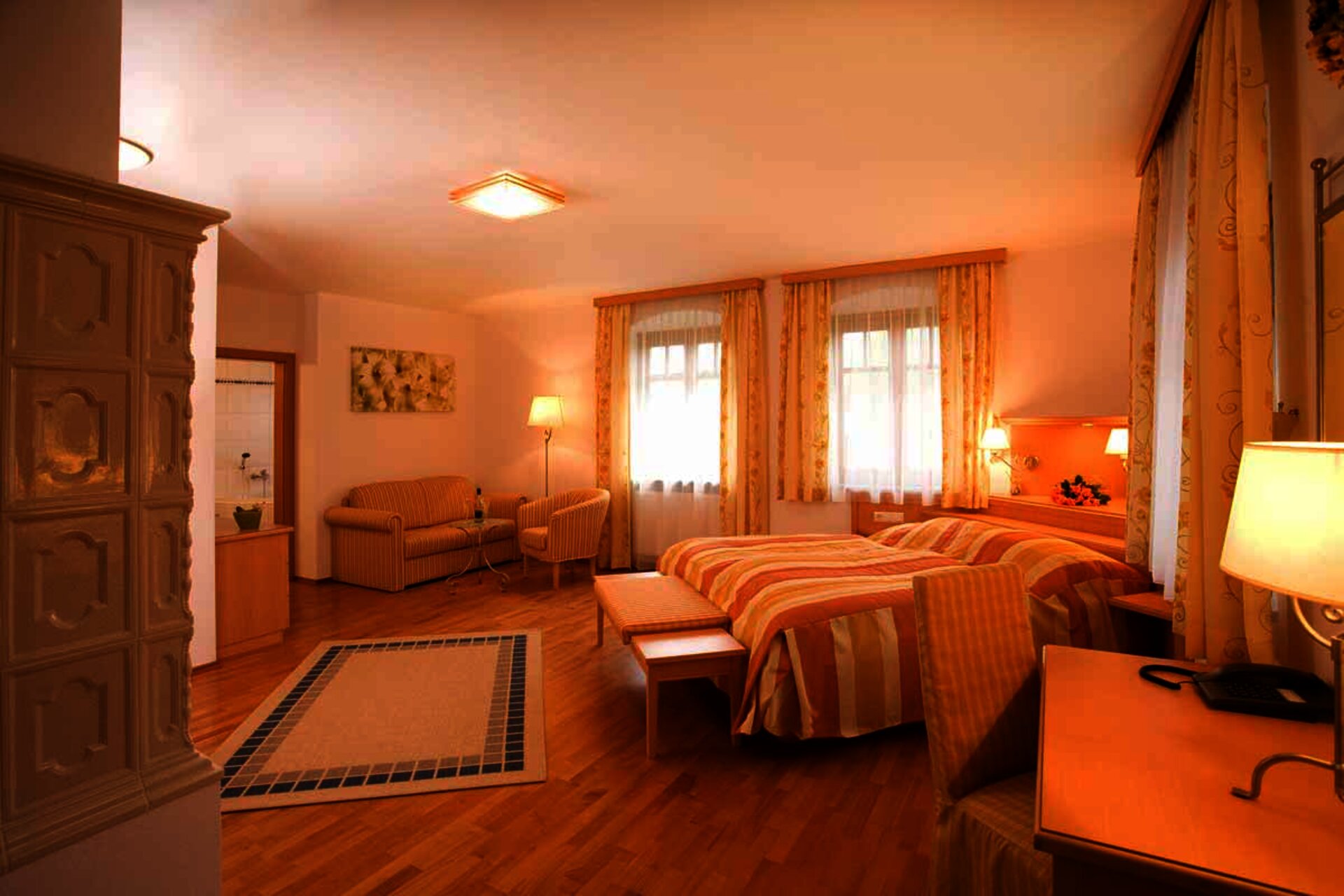 Vorraum, Wohn- und Schlafbereich mit Verbindungstür, Kleiderschrank, Schreibtisch, Badezimmer mit Dusche und Whirlpool, separates WC, kostenloser Internetzugang, Haartrockner, Sat-TV, Kachelofen, Sitzecke, Kühlschrank, Lift
